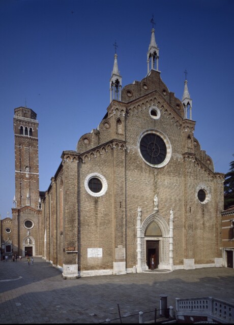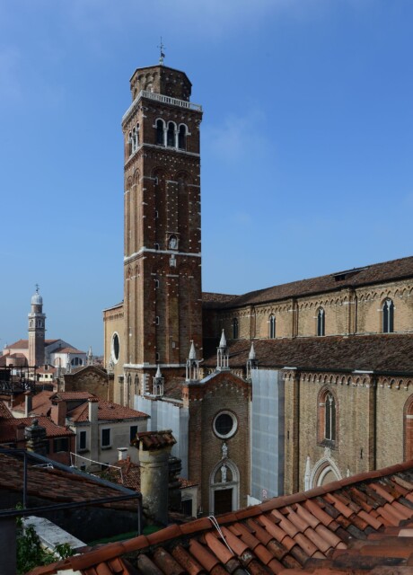 Di stile romanico, raggiunge i 70 metri ed è il più alto di Venezia dopo quello di S. Marco. Dalla sommità si gode uno spettacolo raro di tutta la città e delle isole della Laguna. Fu iniziato dal veneziano Jacopo Celega (1361) e terminato dal figlio Pier Paolo nel 1396. L’interno è a due canne, legate da una rampa che serviva a portare in alto il materiale per la costruzione; sono come due campanili uno dentro l’altro, alleggerito, quello di dentro, da grandi finestre a tutto sesto, mentre piccole monofore lasciano penetrare all’interno una tenue luce. È tutto in cotto, eccettuate le pietre bianche che dividono i tre ordini, le colonne, gli archi della cella campanaria e le colonnine della loggia sovrastante. Nel 1490 fu danneggiato da un fulmine e modificato nella cuspide terminale ancora presente: al posto della piramide di piombo, simile a quella del campanile di S. Marco, venne costruito l’attuale coronamento a tamburo poligonale.